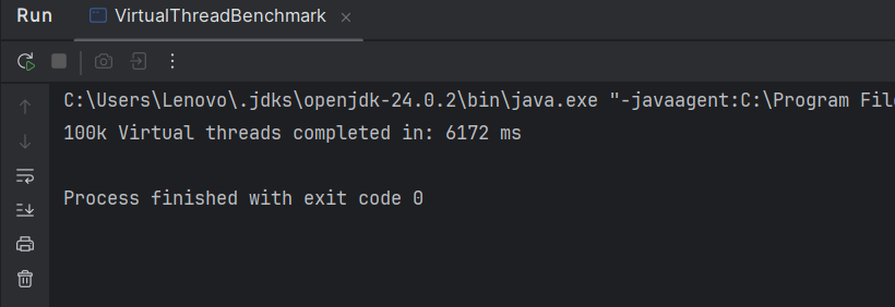 As the benchmark shows, 100K platform thread took just about 25 seconds to complete, while 100K virtual threads finished in just over 6 seconds — nearly four times quicker. Furthermore, to a greater extent importantly, the virtual-thread edition run with a fraction of the computer memory footprint and zero configuration change. This demonstrates exactly why virtual threads are a game-changer for I/O-heavy concurrency in Java.
